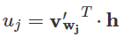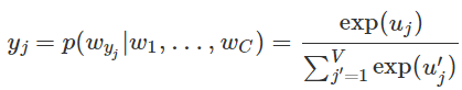 是输入向量与矩阵W加权后的平均。 隐层输出的计算时跳字模型和连续词袋模型的区别之一。然后计算输出层每个节点的输出: