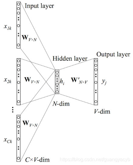 的独热编码组成,隐层是N维向量h,最终的输出层是训练样本中的单词y的独热编码。独特编码的输入向量通过V×N的权重矩阵W与隐层连接,隐层通过N×V的权重矩阵W′与输出层连接