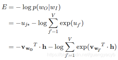 首先定义损失函数,目标是在给定的上下文,最大化输出单词的条件概率,因此损失函数为(这里对上式softmax取对数的相反数):