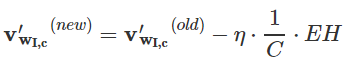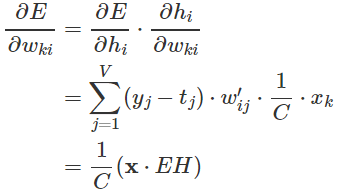 在学习权重矩阵 W 和 W′的过程中,我们先随机初始化,然后不断使用训练样本来计算预测输出与实际输出的误差,并计算误差对权重矩阵元素的梯度,然后沿着梯度方向来纠正参数,这就是一般的随机梯度下降(SGD)。