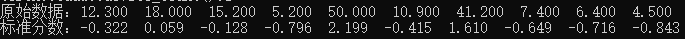 比如对以下数据标准化,12.3对应的标准分数为-0.322,说明12.3比均值小标准差的0.322倍,18.000对应的标准分数为0.059,说明18.000比均值大标准差的0.059倍。