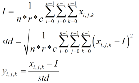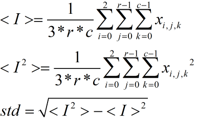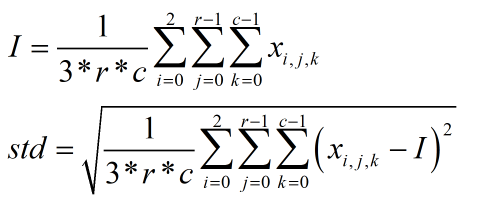 首先我们讲一下标准差的计算,对于3通道r*c图像的均值和标准差,通常按照下式计算: