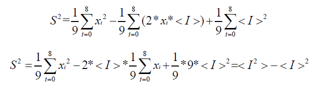 如果按照上式实现代码,需要循环遍历图像两次,一次遍历计算均值,一次遍历计算标准差,而且需要多次开根号,这是很耗时的。为了减少遍历图像和开根号的次数,我们对上式做一定的变换。下面我们举例说明这个变换: