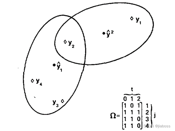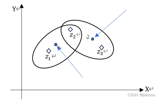 设有两个目标航迹,以这两个航迹的量测预测为中心建立波门,并设下一时刻扫描得到三个回波,这三个回波和相关波门的位置关系如下图所示,试写出其确认矩阵、关联矩阵,并求取量测与不同目标关联的概率。
