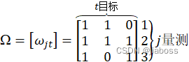 ,即该量测来源于假目标和目标2,这里需要注意得是:在这种情况下由于第一个量测已经来源于目标1,因此,按照确认矩阵的拆分准则2,第二个量测不能再次属于第一个目标,所以没有