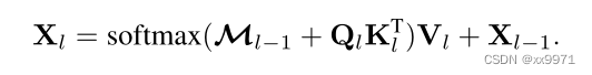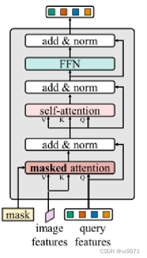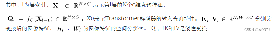 是前面第(l−1)个transformer解码器层调整掩码预测的二值化输出(阈值为0.5)。它被调整到相同的分辨率kl,M0为从X0得到的二进制掩码预测,即在向Transformer解码器输入查询特征之前的预测。