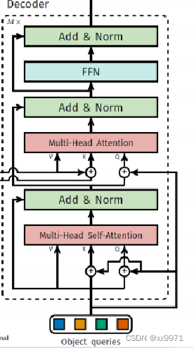 标准的Transformer解码器层由三个模块组成,依次处理查询特性:自注意模块、交叉注意模块和前馈网络(FFN)。此外,查询特性(X0)在被输入到Transformer解码器之前是零初始化的,并且与可学习的位置嵌入相关联。此外,dropout应用于残差连接和注意图。