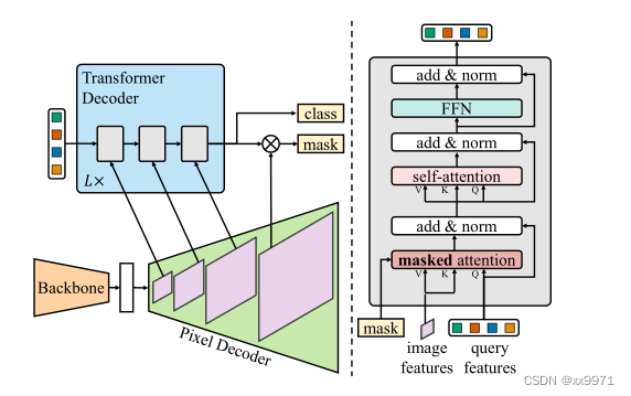 Mask2Former采用与MaskFormer相同的元架构,具有backbone、像素解码器和transformer解码器。