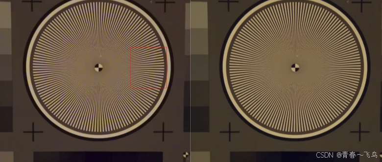 但是边缘增强,并不是越强越好,如下图可以看到,右边锐化后结果图像,红框位置出现了明显黑白边异常,因此调整边缘增强时候,需要主要各个频段增强系数,避免图像异常。