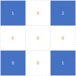 第二步我们需要在输入特征图四周填充k-p-1=2 行、列0(即填充2行0,2列0),变换后特征图如下: