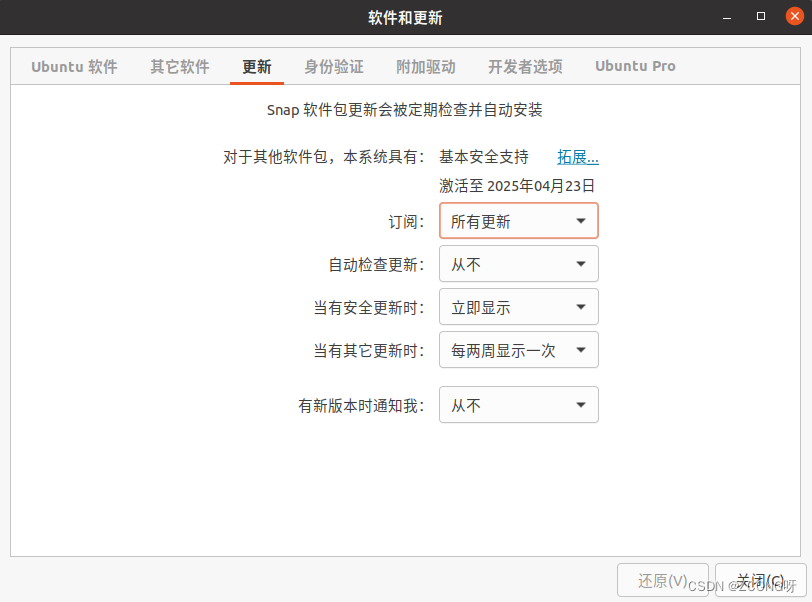 解决办法:在软件安和更新界面,按照如图所示,将订阅一栏改为:所有更新。