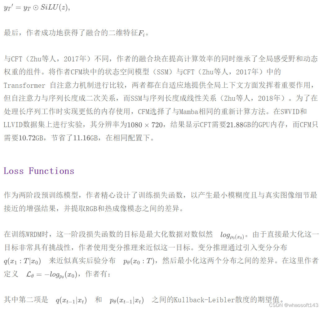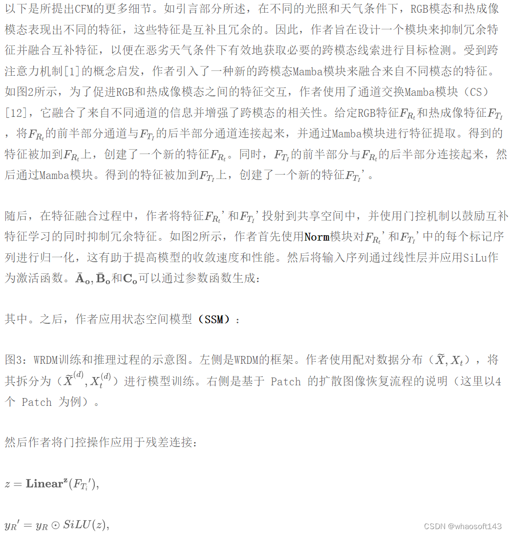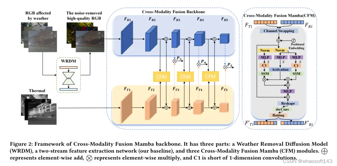 在最小化计算负担的同时。具体来说,在融合红外对应图像之前,使用WRDM来恢复受影响的可见图像,为图像融合网络提供即插即用的兼容性。基于学习逆转来增加噪声的顺序并破坏数据样本的过程,WRDM模型有利于最小化不利天气条件的影响。此外,CFM可以集成到特征提取的主干中,有效地整合来自不同模态的全局上下文信息。最近的研究表明,曼巴(Mamba,2019年)比等效规模的 Transformer 实现了更高的推理速度和整体指标。据作者所知,本研究代表首次尝试将扩散模型和曼巴用于多光谱目标检测。