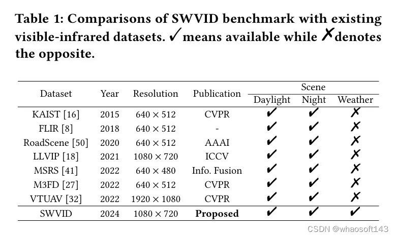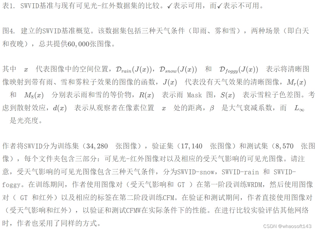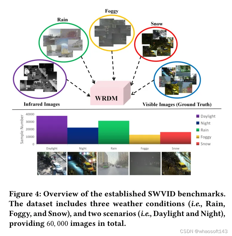 为了促进该领域的研究,作者提出了一种新的可见-红外数据集,名为SWVID,它通过在图像上数学形式化各种天气现象的影响,旨在涵盖多样化的严重天气场景。具体来说,SWVID包含了对齐的可见-红外图像对,涵盖了三种天气条件和两种场景,每种条件和场景均匀分布。