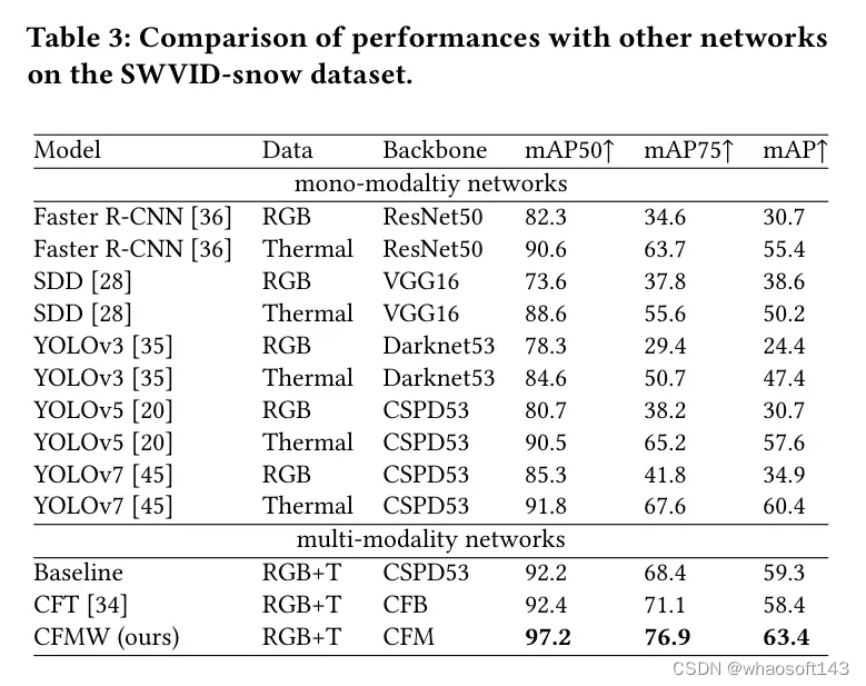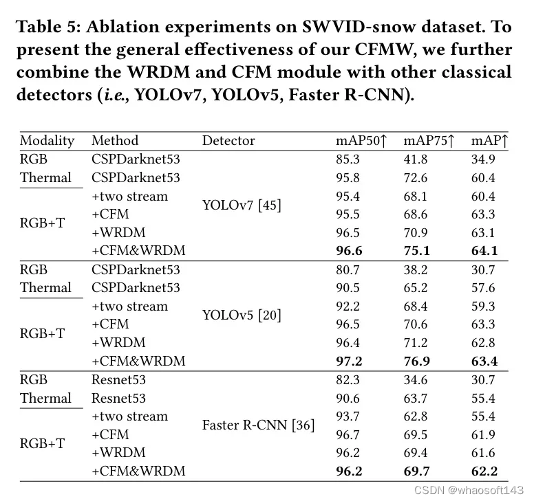 表5. 在SWVID-snow数据集上进行消融实验。为了展示作者CFMW的普遍有效性,作者进一步将WRDM和CFM模块与其他经典检测器(例如,YOLOv7, YOLOv5, Faster R-CNN)结合。