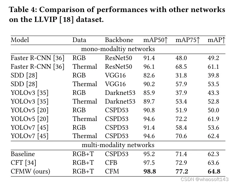 跨模态目标检测比较。如表3和表4所示,作者使用LLVIP [18] 和 SWVID-snow 作为比较数据集。与 SWVID-rain 和 SWVID-foggy 相比,这两个数据集中行人的大小更符合一般目标检测标准。这两个数据集中行人重叠的复杂情况更多,这可以更好地衡量目标检测网络的准确性。表格顶部展示了单模态网络的检测结果,每个网络使用 RGB 模态或热成像模态进行检测。表格底部显示了多模态网络的检测结果,包括作者的 Baseline 模型 CFT [34] 和所提出的 CFMW。根据表3,可以观察到,通过集成 WRDM 和 CFM,CFMW 在每个指标(mAP50:2.3↑, mAP75:4.3↑, mAP:3.0↑)上相对于每种指标上现有的最佳网络在 SWVID-snow 上都取得了压倒性的性能提升,这表明在恶劣天气条件下它具有更好的适应性。同时,如表4所示,CFMW 可以在较低的计算消耗下实现更准确的检测(mAP50:98.8, mAP75:77.2, mAP:64.8),这表明 CFWM 的普遍性。