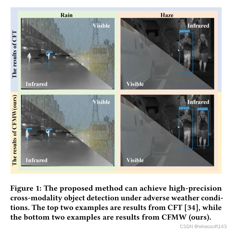 图1。作者提出的方法可以在不利天气条件下实现高精度的跨模态目标检测。顶部两个示例来自CFT(杨等人,2017年),而底部两个示例来自CFMW(作者的)。