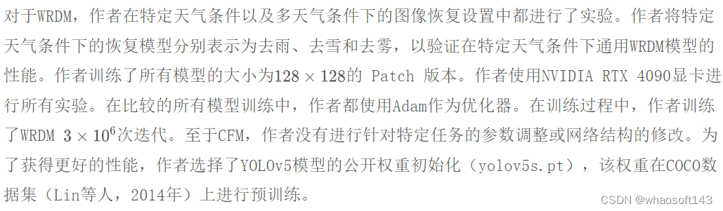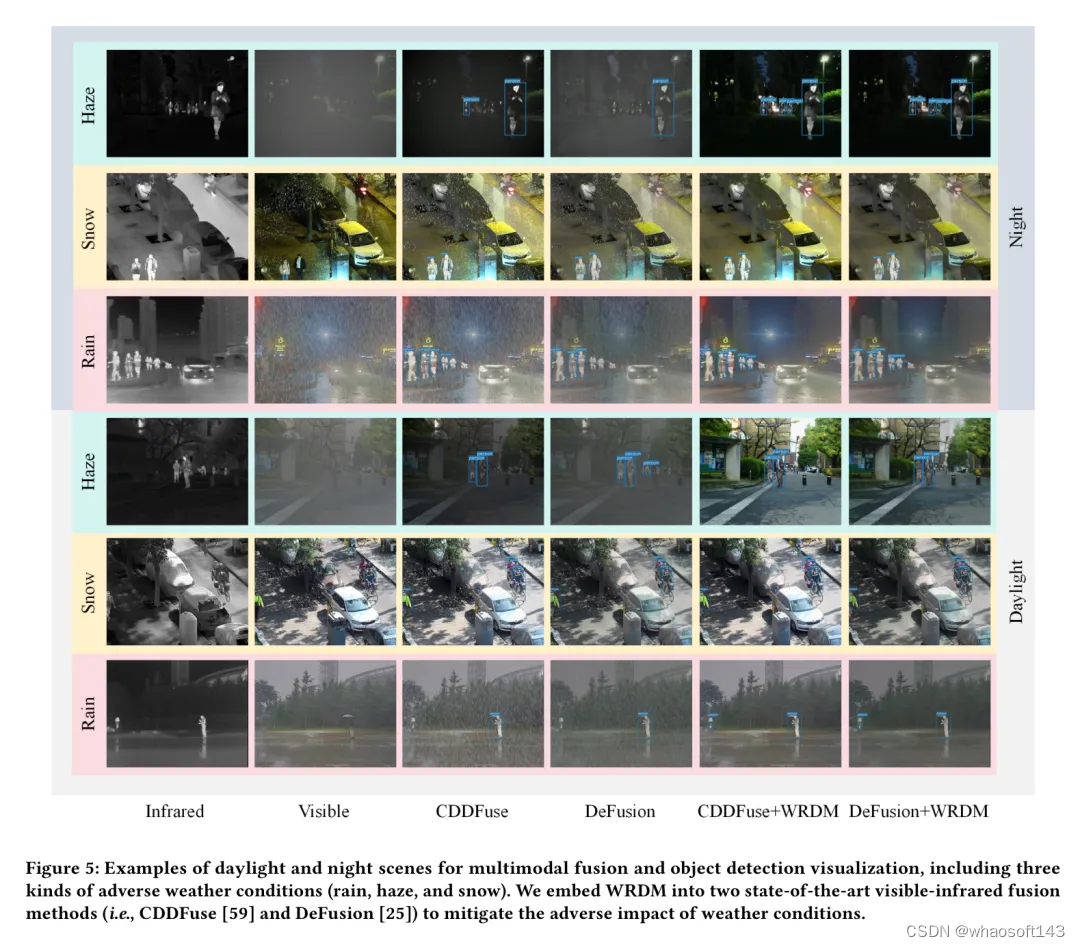 此外,WRDM可以被视为一个插件,嵌入到其他工作中,例如可见光与红外图像融合中,以消除多天气条件的影响,这在图5的实验中得到了证明。 whaosoft aiot http://143ai.com