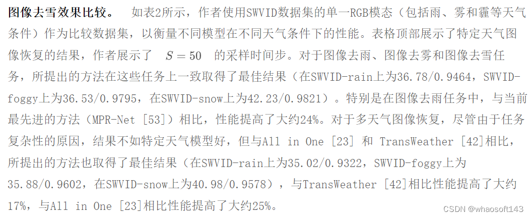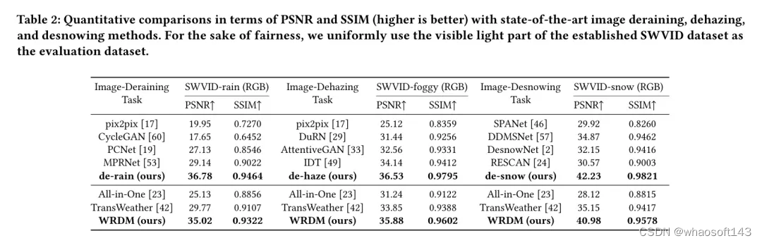 表2. 在PSNR和SSIM(越高越好)方面与最先进的图像去雨、去雾和去雪方法的定量比较。为了公平起见,作者统一使用建立的SWVID数据集的可见光部分作为评估数据集。