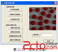 使用Visual C++设计的界面如图12.18所示,包括图像预处理、图像处理和识别、计数结果查看等功能。其中,图像预处理包括打开原始图像、处理成灰度图像、中值滤波处理等功能,图像处理和识别包括图像分割处理、图像边缘检测、图像膨胀填充处理和删除不清晰边缘等功能。按照功能设定相应的按钮,添加一个编辑框控件显示计数结果值,用显示图像的Picture控件来显示要识别的原始图像。