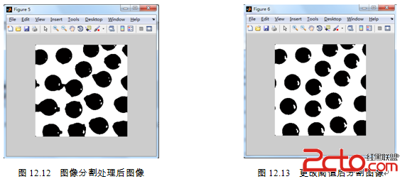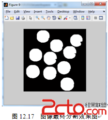 (5)执行程序后,从图12.12可以看出,目标图像间存在连接状态,这不利于实现正确计数,故在图像分割时所取阈值并不合适。可以从MATLAB的Workspace中读取阈值level的值为0.4353,通过给定这个阈值来获得更好的图像分割效果。需要采取实验的方法评估level的值增加或者减小对图像的影响,通过实验取值分析,最后获得合适的阈值为level=0.3,图像效果如图12.13所示。