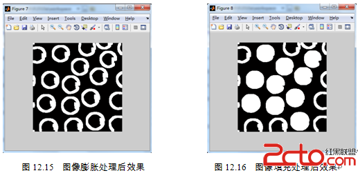(7)从图像边缘检测图像可以看出,药丸的形状不是标准的圆形,且在图像边缘处存在不完整的图形,需要将图像中药丸的形状进行调整,并且删去图像边缘不完整的图形。具体要通过膨胀和填充操作实现,即对图像边缘进行膨胀处理,补全药丸的缺口,然后利用填充命令进行闭合区域的填充。在MATLAB命令窗口中输入如下代码: