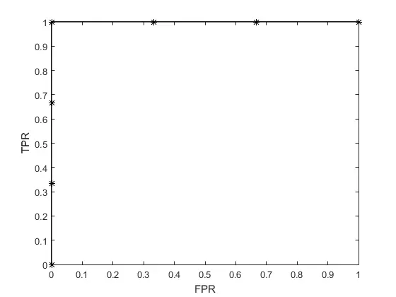 plot(FPR,TPR,'k*-')