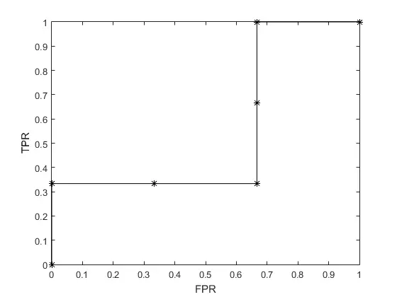 step7:根据上表,选择阈值为0.1,正例中有3个样本的预测值大于等于1,反例中有3个,所以,TPR=1,FPR=1。