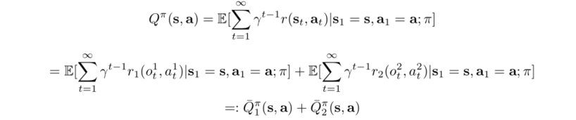Q t o t ≈ c ( s ) + ∑ h = 1 H w h ∑ i = 1 N λ i , h ( s ) Q i = c ( s ) + ∑ h , i w h λ i , h Q i = c ( s ) + ∑ i , h λ ^ i , h Q i Q_{tot}\approx c(s)+\sum_{h=1}^H w_{h} \sum_{i=1}^N\lambda_{i,h}(s)Q_i=c(s)+\sum_{h,i}w_h\lambda_{i,h}Q_i=c(s)+\sum_{i,h}\hat{\lambda}_{i,h}Q_i Qtot≈c(s)+h=1∑Hwhi=1∑Nλi,h(s)Qi=c(s)+h,i∑whλi,hQi=c(s)+i,h∑λ^i,hQi