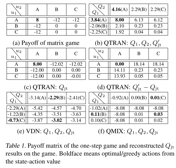 在后续的MARL文章中,QTRAN在SMAC任务上的实际表现并不好,可能是方法中依靠神经网络对 V j t V_{jt} Vjt等网络进行近似会导致估值不准确,进而使得策略学习变得非常困难;对credit assignment假设是各智能体平均分配;