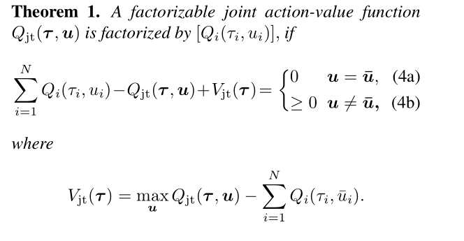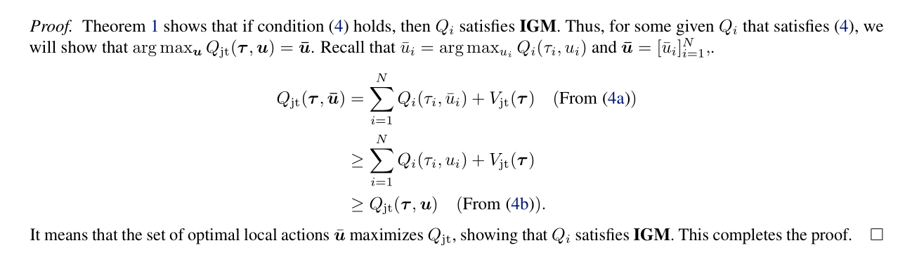 作者首先定义了一个 Q t o t ′ = ∑ i = 1 N Q i ( τ i , u i ) Q_{tot}'=\sum_{i=1}^N Q_{i}(\tau_i,u_i) Qtot′=∑i=1NQi(τi,ui),其实就是上述条件中的求和项,也是VDN中的 Q t o t Q_{tot} Qtot,称之为transformed joint-action value function。这里由于真实的 Q t o t , [ Q i ] Q_{tot},[Q_i] Qtot,[Qi]是满足IGM的,而根据上述定义, Q t o t ′ , [ Q i ] Q_{tot}',[Q_i] Qtot′,[Qi]本身也是符合IGM的,所以 Q t o t , Q t o t ′ Q_{tot},Q_{tot}' Qtot,Qtot′的optimal joint action是一样的,即 arg max u Q t o t ( τ , u ) = arg max u Q t o t ′ ( τ , u ) \argmax_{\bm{u}}Q_{tot}(\bm{\tau},\bm u)=\argmax_{\bm{u}}Q_{tot}'(\bm{\tau},\bm u) argmaxuQtot(τ,u)=argmaxuQtot′(τ,u)。