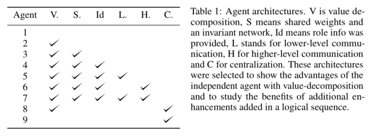 每个智能体使用的网络架构及相关tricks:1)使用了LSTM网络层解决部分可观测问题;2)使用了advantage function A ( s , a ) A(s,a) A(s,a)对Q-function进行计算。3)有些智能体采用了information channels(low-level和high-level),具体实现就是选择将不同层的输出向量拼接到一起。 4)采用了eligibility traces。