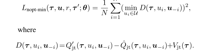 min [ Q t o t ′ ( τ , u 1 , u − 1 ) − Q t o t ( τ , u 1 , u − 1 ) + V j t ( τ ) Q t o t ′ ( τ , u 2 , u − 2 ) − Q t o t ( τ , u 2 , u − 2 ) + V j t ( τ ) ⋮ Q t o t ′ ( τ , u N , u − N ) − Q t o t ( τ , u N , u − 2 ) + V j t ( τ ) ] = 0 \begin{equation} \min\left[ \begin{matrix} Q_{tot}'(\bm{\tau},u_1,\bm{u_{-1}})-Q_{tot}(\bm{\tau},u_1,\bm{u_{-1}})+V_{jt}(\bm{\tau})\\ Q_{tot}'(\bm{\tau},u_2,\bm{u_{-2}})-Q_{tot}(\bm{\tau},u_2,\bm{u_{-2}})+V_{jt}(\bm{\tau})\\ \quad \quad \quad \;\; \vdots \quad \quad \\ Q_{tot}'(\bm{\tau},u_N,\bm{u_{-N}})-Q_{tot}(\bm{\tau},u_N,\bm{u_{-2}})+V_{jt}(\bm{\tau})\\ \end{matrix} \right]=0 \end{equation} min⎣