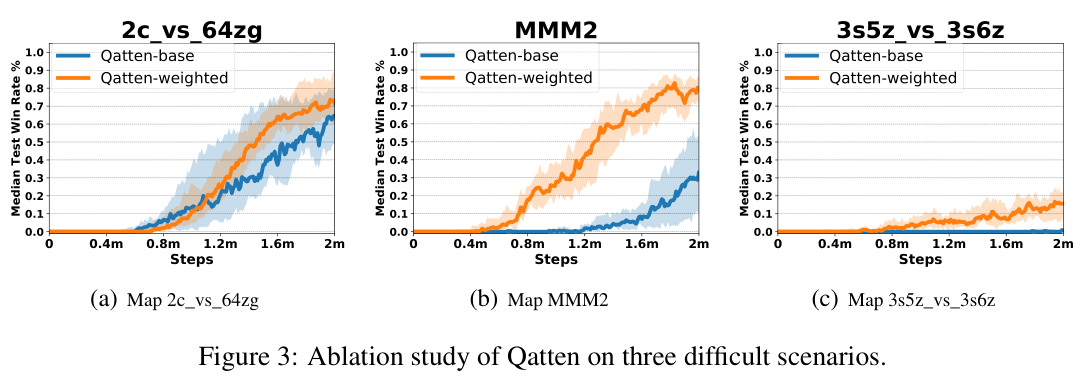 Ablation study:比较Qatten-weighted和Qatten-base,使用的是三个困难的地图。