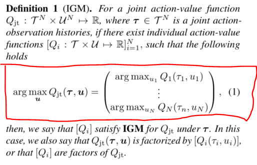 值分解的这一系列算法首先都需要满足Individual-Global-Max(IGM)这一原理,然后才是加上不同的约束条件进行值分解。所以先将QTRAN中正式提及的IGM放在这里: