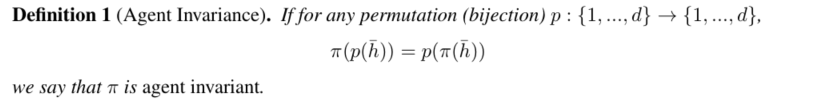 随着智能体数量的增加,就算是Independent learning,其网络数量也会剧增。因此一种方式是只采用一个网络(Weight sharing),也就引出了智能体不变性agent invariance的概念,见下图,该概念用于避免Lazy agent的问题。lazy agent问题文中没有完整的描述。但个人理解lazy agent其实就是credit assignment问题,在多智能体环境中,有些智能体会对整个集体的贡献高于其他智能体,那么这时候其他智能体就没有动力再为这个系统做出贡献,不会再探索环境,因为过多的探索很可能会导致目前已经不错的策略失效(类比20%的人养着80%的人)。