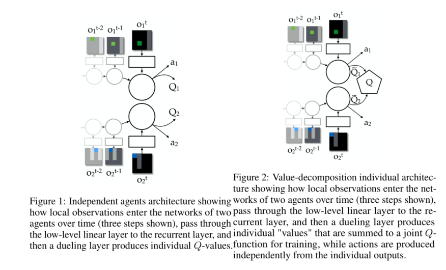 VDN的动机就是为了避免independent learning会遇到的误导性的奖赏值问题,原因在于当前智能体无法观测到teammates的行为。所提出的additive value decomposition这一模式中每个智能体只需要根据local observations对该值进行估计,同时训练中对这些local Q-value相加一定程度上解决了智能体相互的协同问题。