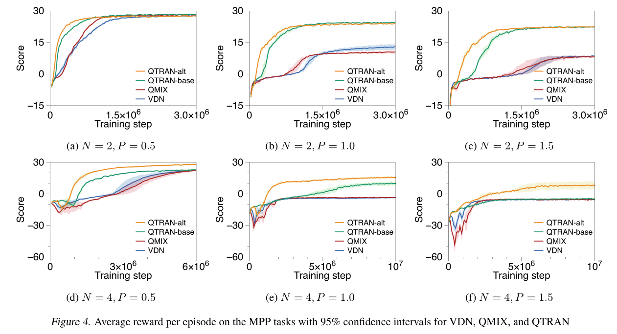 结果说明QTRAN可以处理非线性的任务等。在MPP任务中,QTRAN-base和QTRAN-alt的性能差异可能取决于智能体数量N,N越大,QTRAN-alt的表现越好。