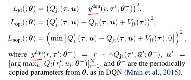 第一项的目的是让网络输出的 Q j t Q_{jt} Qjt接近所谓真实的joint action-value(其实就是标准的DQN式更新,跟QMIX中的更新方式相似),第二项也是保证上述条件(4)能够被满足,注意在训练过程中最优策略被选择的概率极低,所以样本效率也会下降,所以将其中的 Q j t Q_{jt} Qjt设置为固定的,以稳定训练过程;第三项能够保证选择的动作是最优的,逐步将满足(4b)的动作变成满足条件(4a)(最小化至0)。