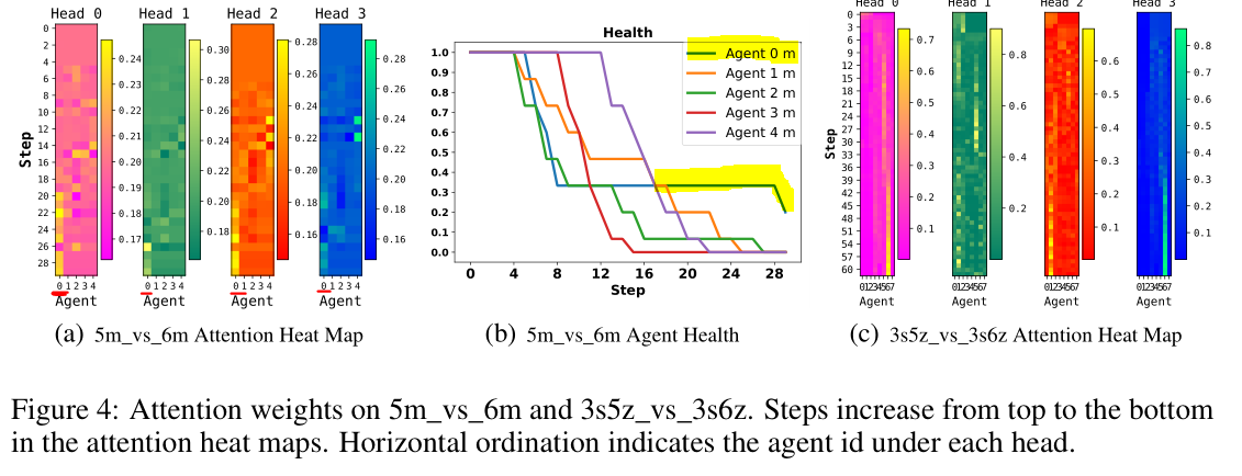 Attention Analysis:对attention weights λ i , h \lambda_{i,h} λi,h进行可视化。得到的是每个head的attention weight heat map。heat map中的每张图对应每个head,每张heat map中的横轴表示每个智能体,纵轴从上到下表示timestep。从图a中可以看出,allies的attention weights是相似的;图中Unit 0获得的权重系数最高,因为其最终存活了。在图c中,这些weigts差距更大,Qatten相比VDN, QMIX来说可以估计出该场景下 Q t o t Q_{tot} Qtot与 Q i Q_i Qi的一些关系,例如,在任务开始时某个智能体获得了相比于其他智能体更多的attention。