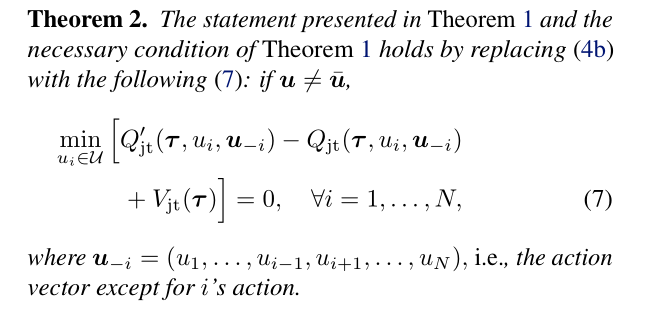 与QTRAN-base不同的是其采用了counterfactual network。作者发现条件(4b)太宽松loose,导致由 Q t o t ′ + V j t Q_{tot}'+V_{jt} Qtot′+Vjt构建出的joint Q-value不准确,其中的一种可能性是非最优与最优动作下的 Q t o t ′ Q_{tot}' Qtot′之间误差较小,但代入到 Q t o t Q_{tot} Qtot时就会导致两者的误差很大,即 Q t o t ′ ( τ , u ˉ ) − Q t o t ′ ( τ , u ) < < Q t o t ( τ , u ˉ ) − Q t o t ( τ , u ) Q_{tot}'(\bm{\tau},\bar{\bm u})-Q_{tot}'(\bm{\tau},\bm u)<<Q_{tot}(\bm{\tau},\bar{\bm u})-Q_{tot}(\bm{\tau},\bm u) Qtot′(τ,uˉ)−Qtot′(τ,u)<<Qtot(τ,uˉ)−Qtot(τ,u),因此导致训练不稳定。所以作者进一步对此条件(4b)进行限制,从而得到定理2,其条件强于(4b):