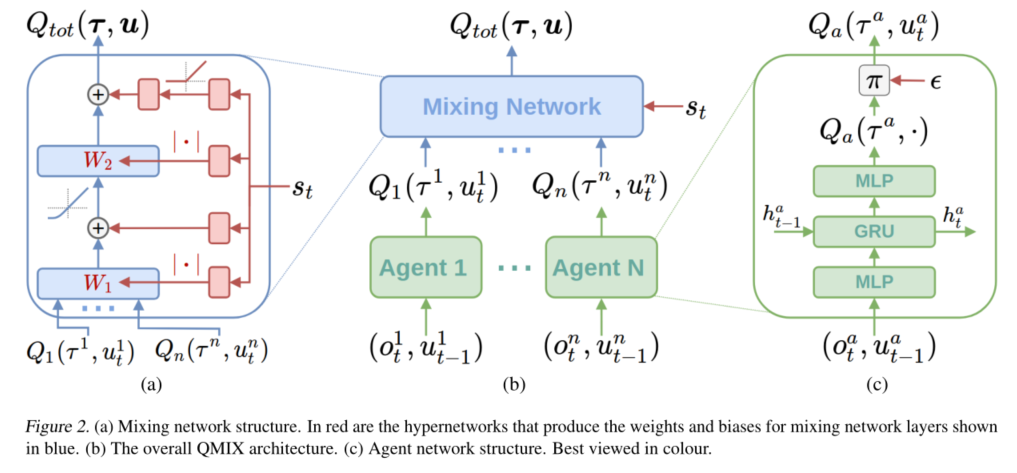 QMIX构建了三个模块(agent networks, mixing network, 一组hypernetworks)来满足单调性约束条件,其中的mixing network模块尤为重要。算法的结构图见下图: