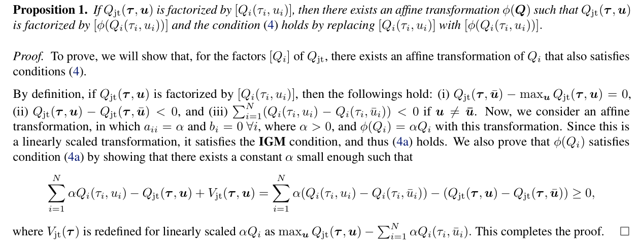 必要性:其次在affine transformation的条件下上述条件也是IGM的必要条件,即存在一个affine transformation ϕ ( Q ) = A ⋅ Q + B \phi(\bm Q)=A\cdot \bm Q+B ϕ(Q)=A⋅Q+B,其中 Q = [ Q i ] i = 1 N \bm Q=[Q_{i}]_{i=1}^N Q=[Qi]i=1N(从附录中推断得到), A = [ a i i ] ∈ R + N × N A=[a_{ii}]\in \mathbb{R}_+^{N \times N} A=[aii]∈R+N×N是一个对称对角矩阵,其中 a i i > 0 , ∀ i a_{ii}>0,\forall i aii>0,∀i, B = [ b i ] ∈ R N B=[b_i]\in \mathbb{R}^N B=[bi]∈RN,那么对于每个local Q-value function来说有 ϕ ( Q i ( τ i , u i ) ) = a i i Q i ( τ i , u i ) + b i \phi(Q_{i}(\tau_i,u_i))=a_{ii}Q_i(\tau_i,u_i)+b_i ϕ(Qi(τi,ui))=aiiQi(τi,ui)+bi。如果 Q t o t Q_{tot} Qtot能被 [ Q i ] [Q_{i}] [Qi]分解(即满足IGM原理,文中的可分解factorizable就指的是满足IGM条件),则上述条件通过将 Q i Q_{i} Qi换成 a i i Q i + b i a_{ii}Q_i+b_i aiiQi+bi成立。
