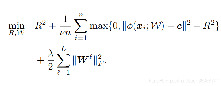 该性能函数被称为:Soft-boundary Deep SVDD。在该式中,第一项与(1)式相同,都是约束的超球体