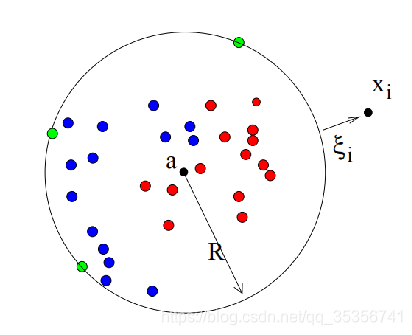 的半径,即希望所建立的超球体体积尽可能地小。在第二项中,其最小化超球体外的所有异常点到超球体