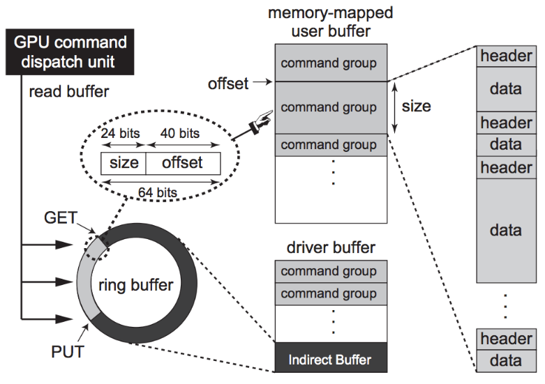 GPU channel是GPU与CPU之间的桥接接口,通过CPU向GPU发送GPU指令的唯一通道,GPU channel包含了两类用于存储GPU指令的buffer: