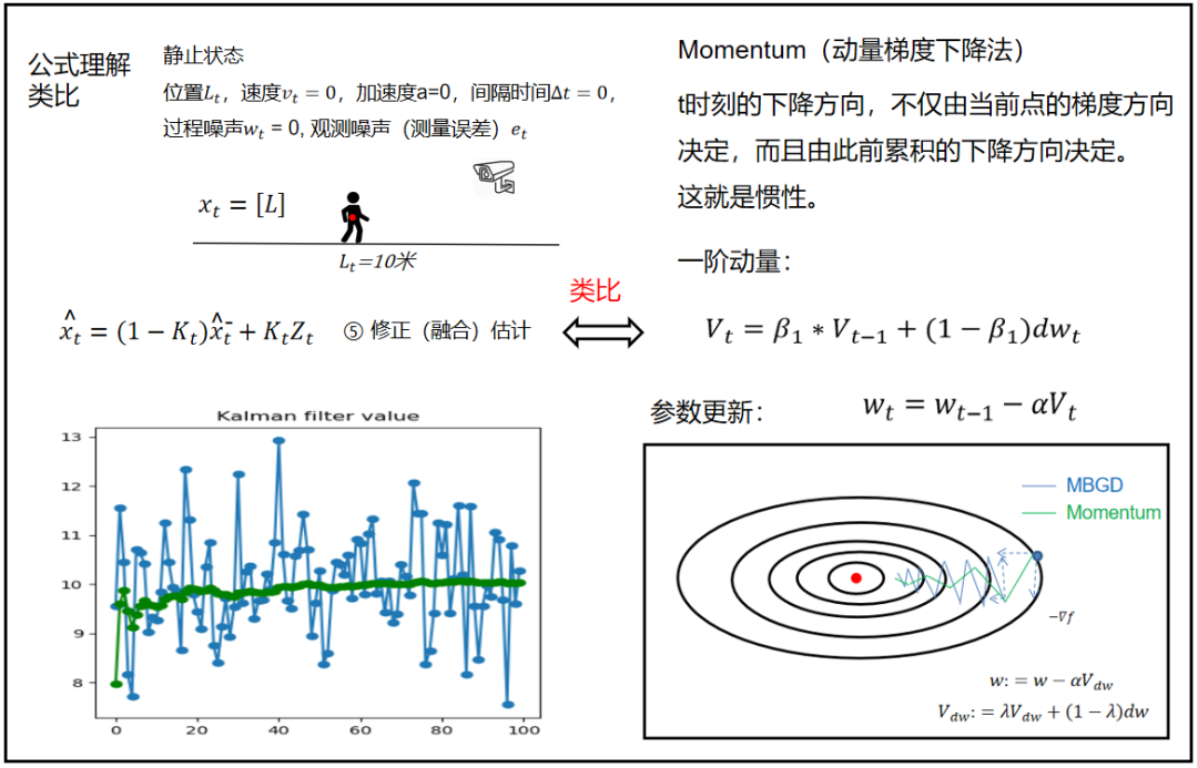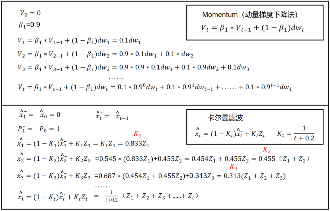 当我看到卡尔曼滤波的融合公式的时候,第一时间想到了Momentum的一阶动量公式,仿佛卡尔曼滤波的这个公式在哪里见过。