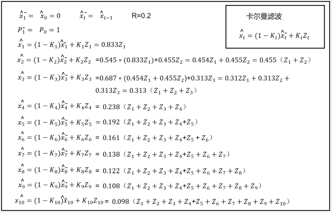 最后发现相当于每个测量值权重一样了,只是权重相加不等于1,当然,当t很大的时候,就很接近1了。
