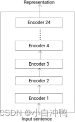 BERT-large:包含24个编码器层,每个编码器使用16个注意头,编码器中的全连接网络包含1024个隐藏单元。因此,从该模型中得到的向量大小也是1024。因此,BERT-large模型:L=24,A=16,H=1024,该模型的总参数大小为340M。该模型如下图所示: