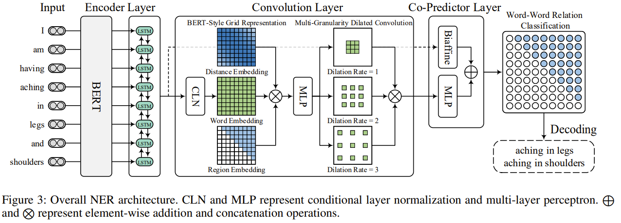 - 二就是实线所示的部分,也即本文提出的方法:其首先经过一个conditional layer normalization层得到Word Embedding,与另外两个Distance Embedding和Region Embedding进行concatenation操作后,过MLP层,然后进行卷积操作。三个Embedding矩阵作者是类比BERT的三种Embedding输入,其中region Embedding 的构建就是基于本文提出的两个概念出发,distance embedding表示句子字词之间的相对距离。