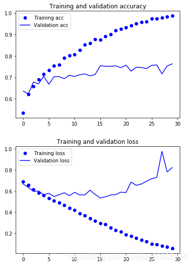 可以发现随着时间的增加,训练精度也在上升,直到接近100%,训练损失也在下降,直到接近0。但是验证精度大约在72%-78%之间,验证损失大约在第15轮到达最小值,由于训练数据较少,所以产生了过拟合。那么就要降低过拟合,除了之间的dropout和L2正则化。在图像处理方面常会用到数据增强。
